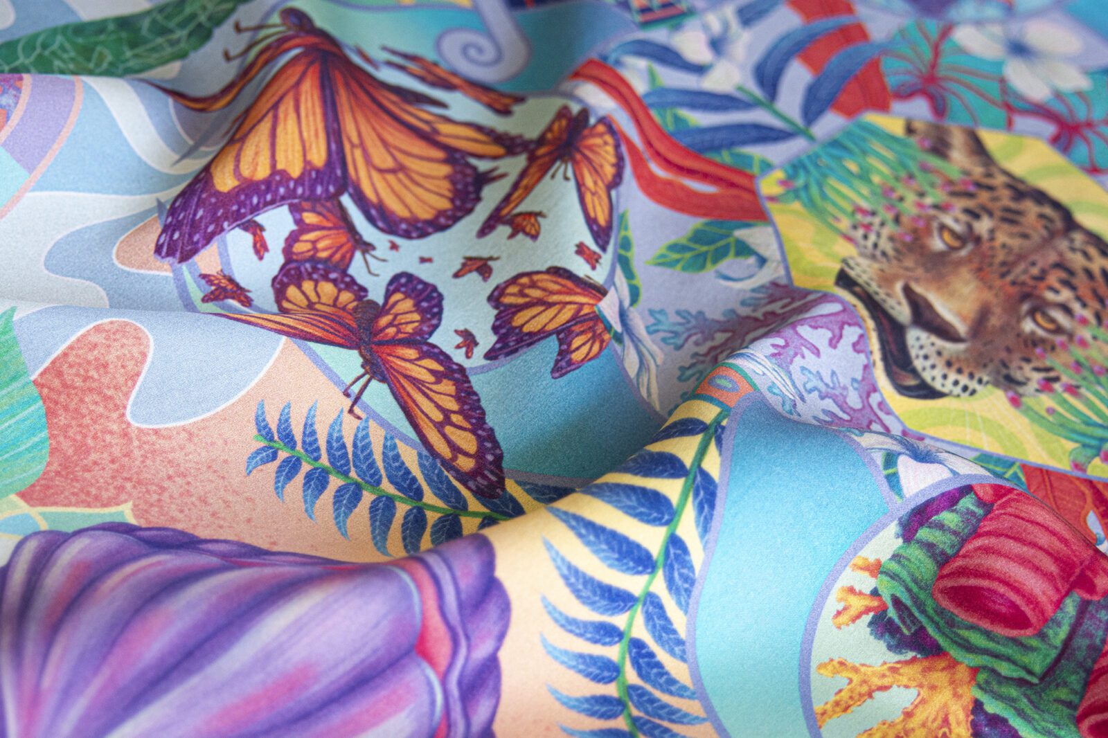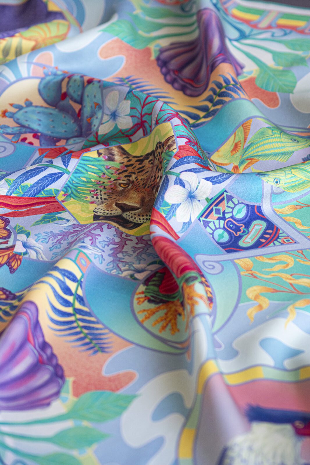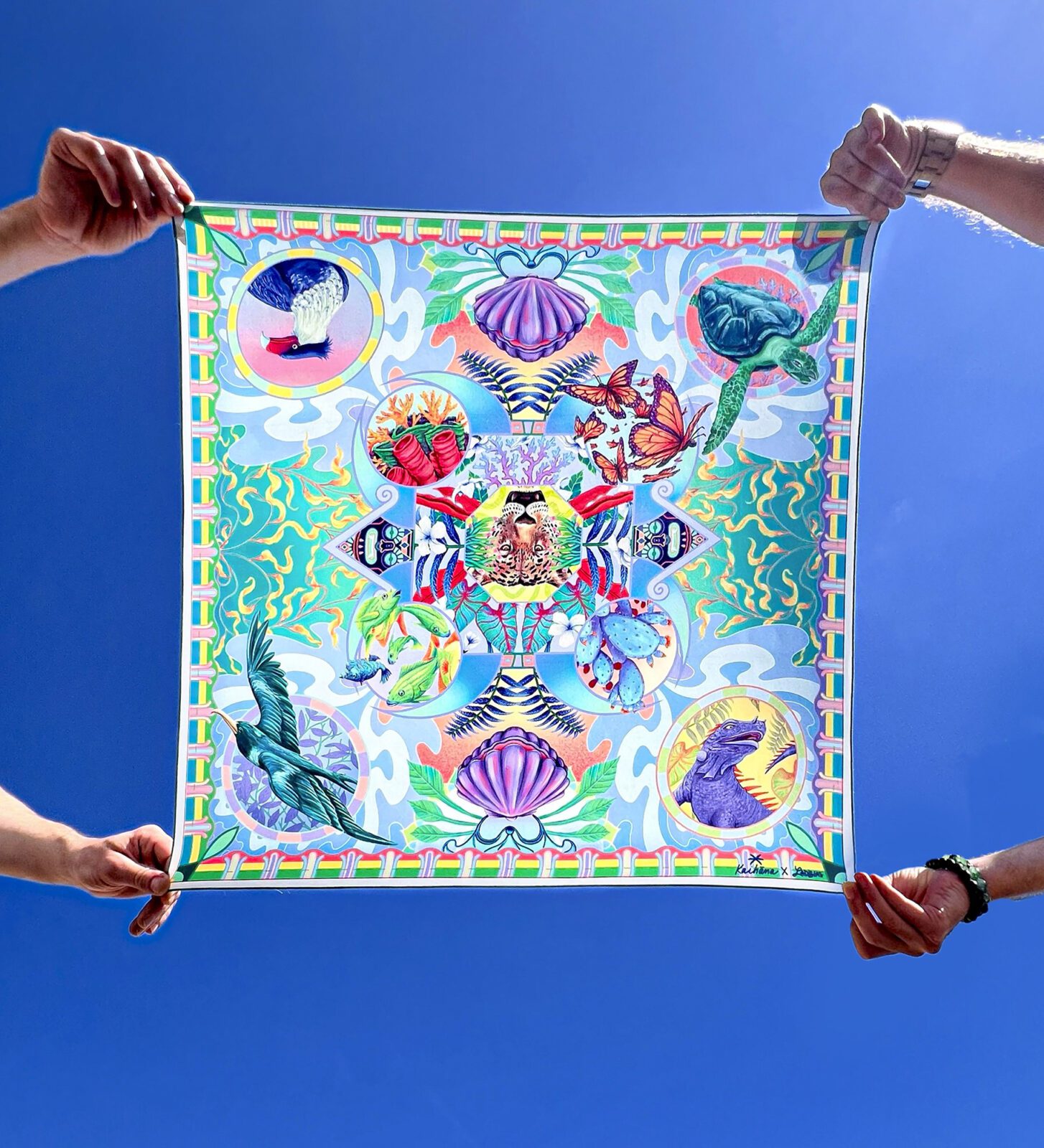 After sharing this idea for the collaboration, we were both aligned with the vision: Creating a colorful design that would pay tribute to the richness and diversity of Mexico. Directly inspired by the places, landscapes, and wildlife I saw during my travel. We named this scarf design “Alma Selva“.