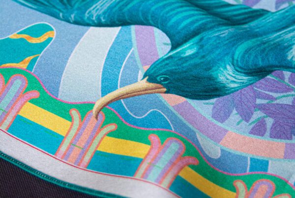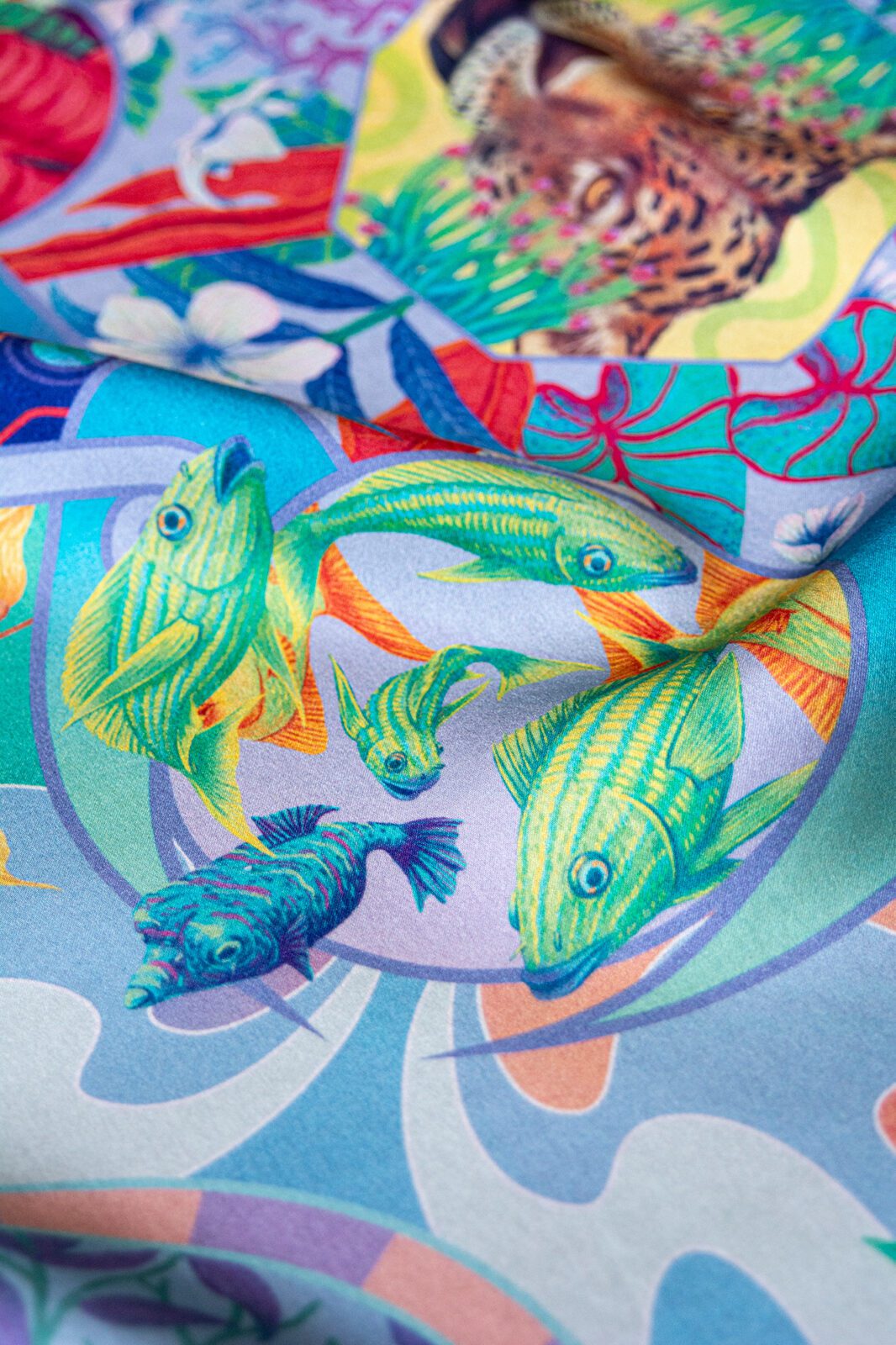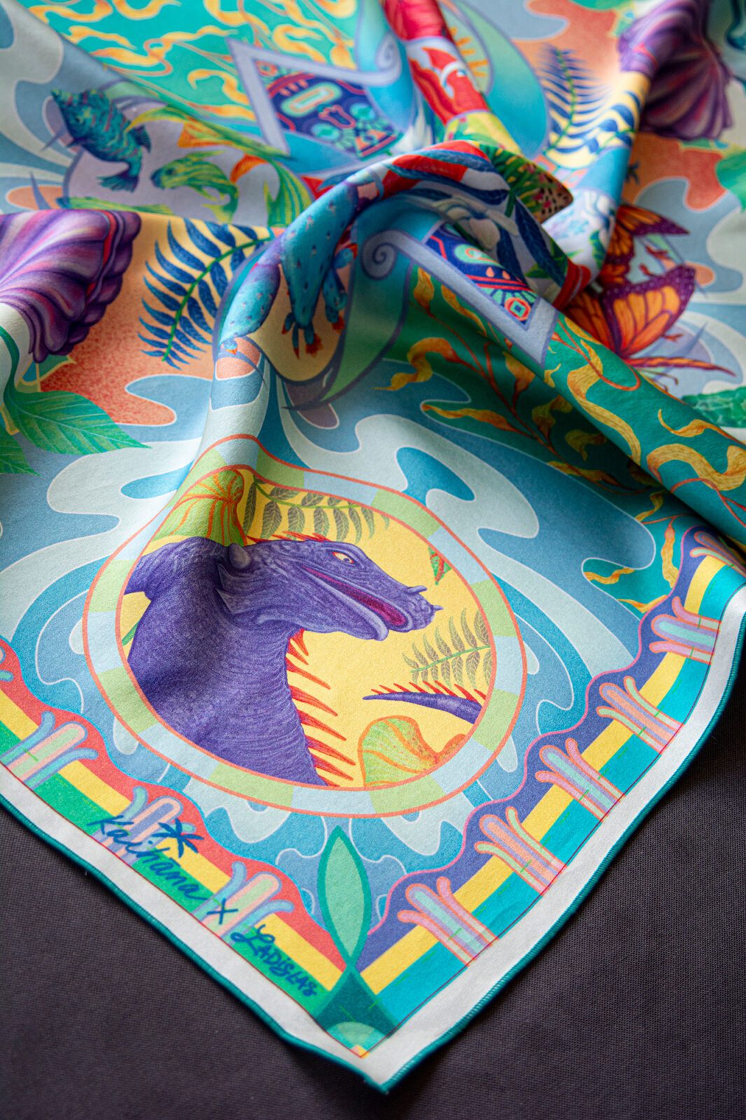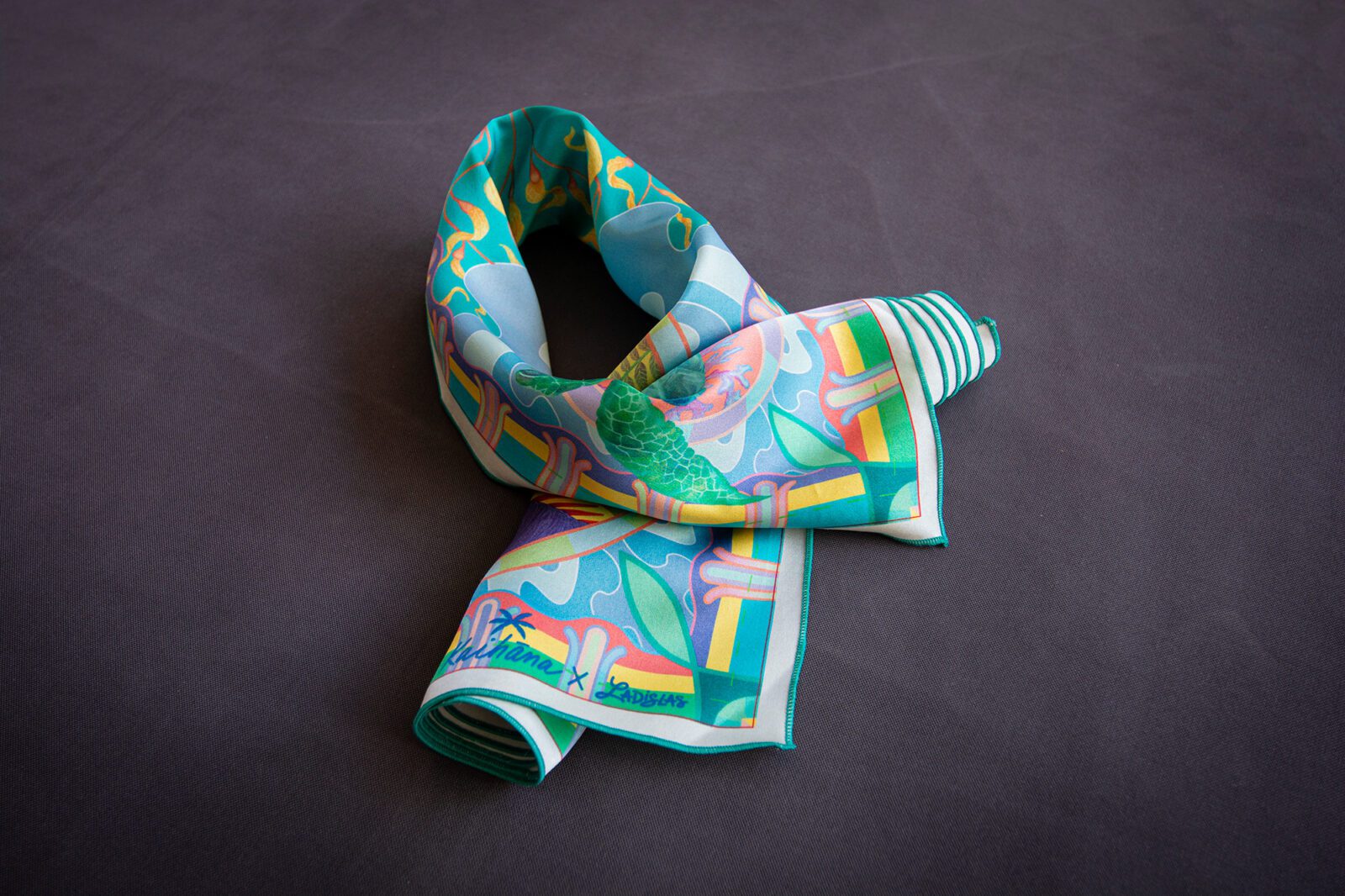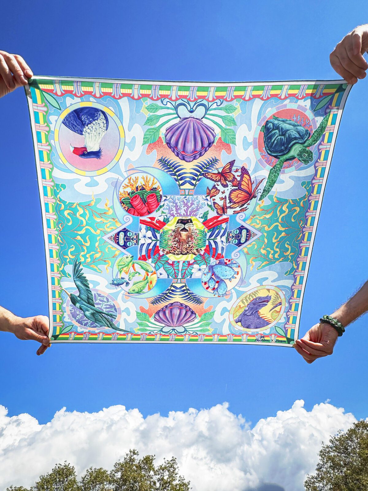 You can read more about this collaboration, the story behind this design on this page : “Alma Selva” capsule artist scarf – LadislasXKaihana interview